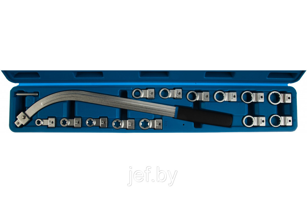 Накидной удлиненный изогнутый ключ в наборе со сменными насадками 15 предметов ROCKFORCE RF-40131515 позволяет работать с автомобилями. Увеличенная длина рукоятки и специальный изгиб существенно упрощают доступ к крепежу.