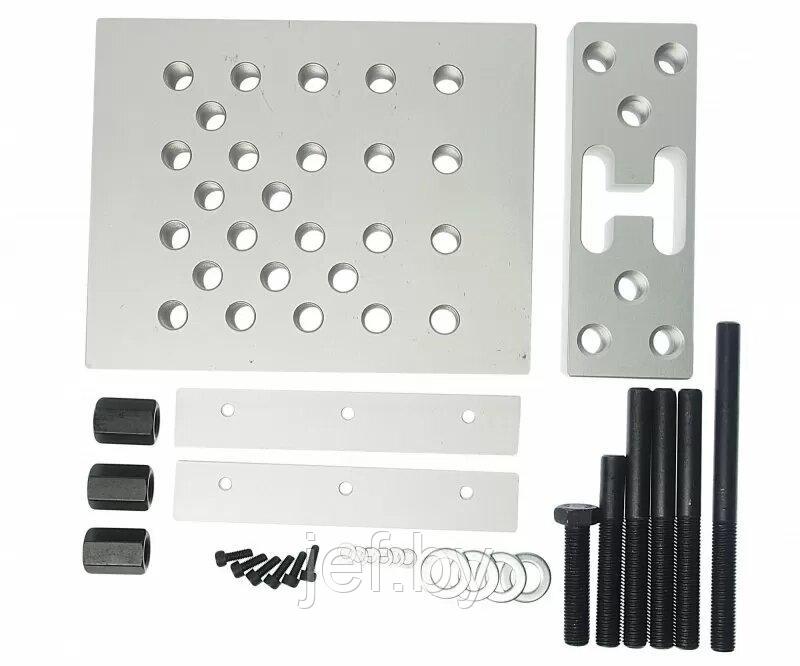 Монтажная опора / подставка для ручного пресса представляет собой специальное приспособление, используемое для поддержки и фиксации подшипников, сайлентблоков и других составных частей во время процесса их установки. Комплектация: основной монтажный блок (на который устанавливаются и фиксируются составные части), дополнительный монтажный блок (позволяет создать дополнительные точки опоры или регулировать положение деталей во время монтажа), монтажные пальцы 6 шт. (используются для правильного позиционирования и фиксации деталей во время их установки).