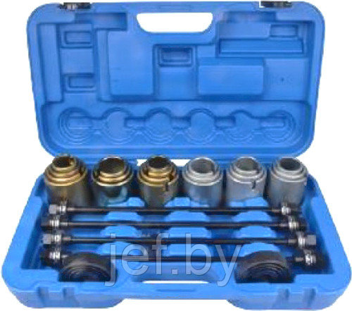 Одной из наиболее частых операций, связанных с ремонтом ходовой части автомобилей, является замена изношенных резиномеханических шарниров и подшипников.Применяя универсальный комплект съемных и монтажных приспособлений, автомеханик может производить необходимые работы, не снимая ремонтируемые узлы с автомобиля, и избежать рисков повреждения деталей и посадочных мест. В данный **набор инструментов**, **позволяющий снимать и монтировать втулки**, **подшипники и сайлентблоки** входит 26 предметов, предназначен для работ с валами и резьбовыми соединениями М10, 12, 14 и 16, а также множеством типоразмеров цилиндрических и конусовидных резиновых втулок. Особое преимущество данного комплекта заключается в универсальности. Имея его в своем распоряжении, мастеру не придется тратиться на покупку дорогого специализированного инструмента для ремонта конкретных моделей автомобилей. Для удобства применения **набор инструментов длязамены сайлентблокови подшипников** комплектуется кейсом.