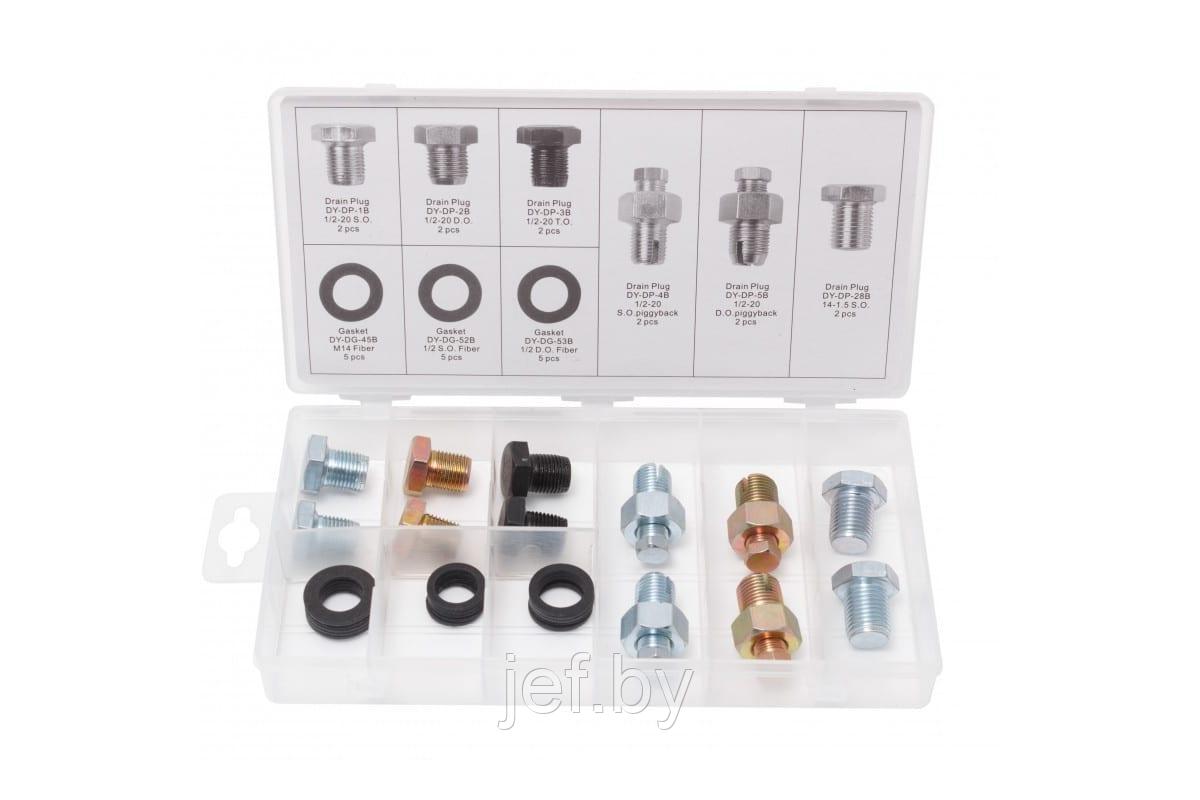 Набор маслосливных пробок - незаменимый помощник в ремонте и обслуживании автомобилей. В комплекте 27 предметов, включая шайбы, для плотного закрытия отверстия для слива моторного масла. Органайзер из прочного пластика обеспечивает удобное хранение и быстрый доступ к необходимым инструментам. Этот набор подойдет для большинства моделей автомобилей и станет незаменимым помощником в работе автомехаников и автолюбителей. Комплектация: сливные пробки DY-DP- 1B резьба 1/2"-20 2шт., сливные пробки DY-DP- 2B резьба 1/2"-20 2шт., сливные пробки DY-DP- 3B резьба 1/2"-20 2шт., сливные пробки DY-DP- 4B резьба 1/2"-20 2шт., сливные пробки DY-DP- 5B резьба 1/2"-20 2шт., сливные пробки DY-DP- 28B резьба М14х1.5 2шт., шайбы фибровые DY-DG-45B внутренний диаметр 14мм 5шт, шайбы фибровые DY-DG-52B внутренний диаметр 1/2"5шт, шайбы фибровые DY-DG-53B внутренний диаметр 1/2"5шт, кейс.