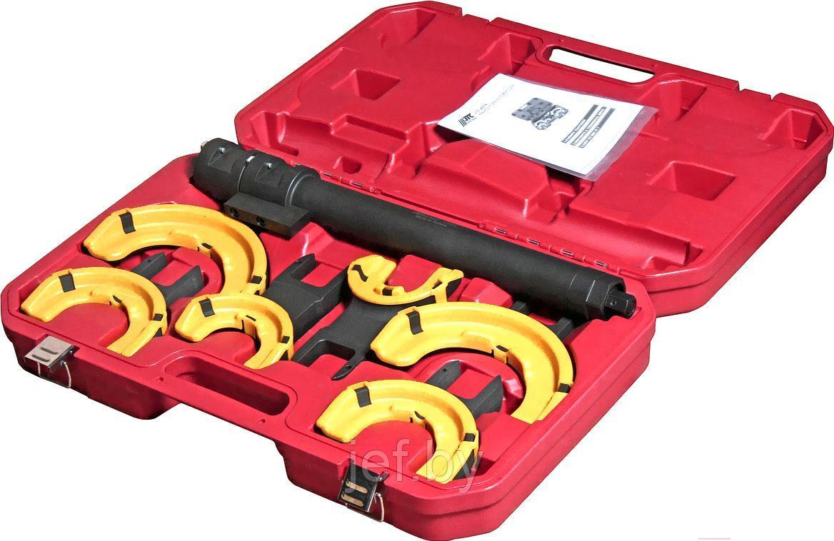 Набор со стяжкой пружин и 3-мя парами С-образных захватов с пластиковыми накладками, 7 предметов в кейсе - это надежный инструмент, предназначенный для безопасной и удобной установки и удаления пружин на автомобильной подвеске. Этот компрессор пружин специально создан для стоек McPherson для быстрого и удобного сжатия пружин стоек передней и задней подвески автомобиля, что позволяет произвести ее замену, ремонт и замену амортизатора или других деталей подвески. Инструмент выполнен из прочной углеродистой стали, что обеспечивает долгий срок службы и устойчивость к нагрузкам. Тип механический, тип установки переносной, рабочий ход 80 - 317 мм. Подходит для различных видов автомобилей и разных задач по обслуживанию и ремонту подвески. В комплекте: стяжка, 2 пластины - диаметр 80 мм., 2 пластины - диаметр 110 мм., 2 пластины - диаметр 165 мм., кейс.