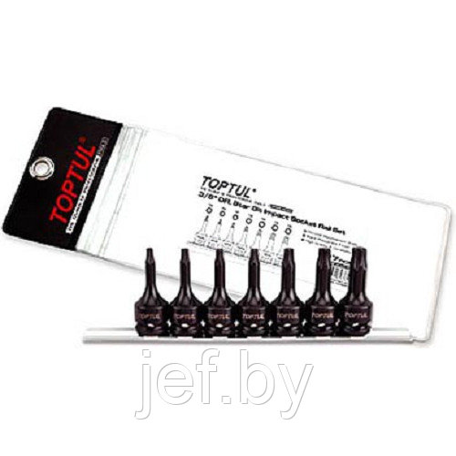 Набор бит шестигранных под головку 3/8" на подвесе TOPTUL включает в себя 7 бит (T20-T50), обработанных черным фосфатом. Применяется в качестве оснастки для гайковерта. Рекомендуется для профессионального использования.